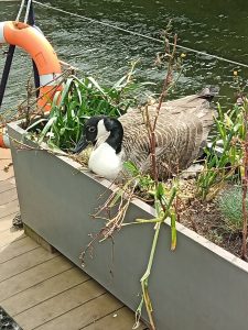 Spring brings new life. With a nesting goose on one of the neighbouring boats, and hatching goslings in May, we feel like proud grandparents when we see the babies hatched safe and sound, though it can be quite stressful seeing them swimming around through the first weeks of life. With a number of predators such as herons, pike and foxes to navigate, I am amazed when any of them survive, but they come to us for feeding, because we always have a supply of nutritional floating swan and duck food to hand.